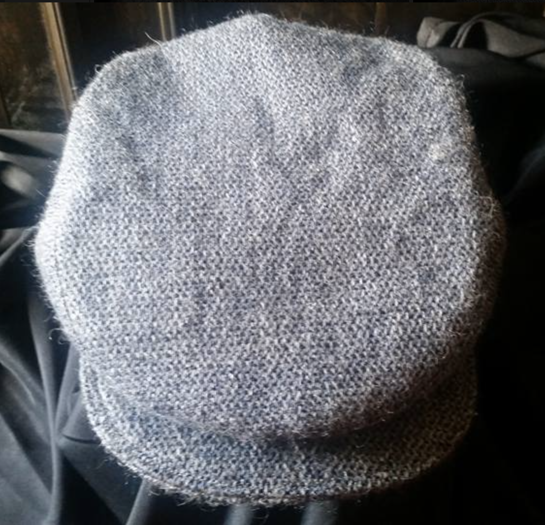 This Irish cap has a gorgeous sheen from the handspun Gotland wool warp. And woven with blue and black cotton wefts.