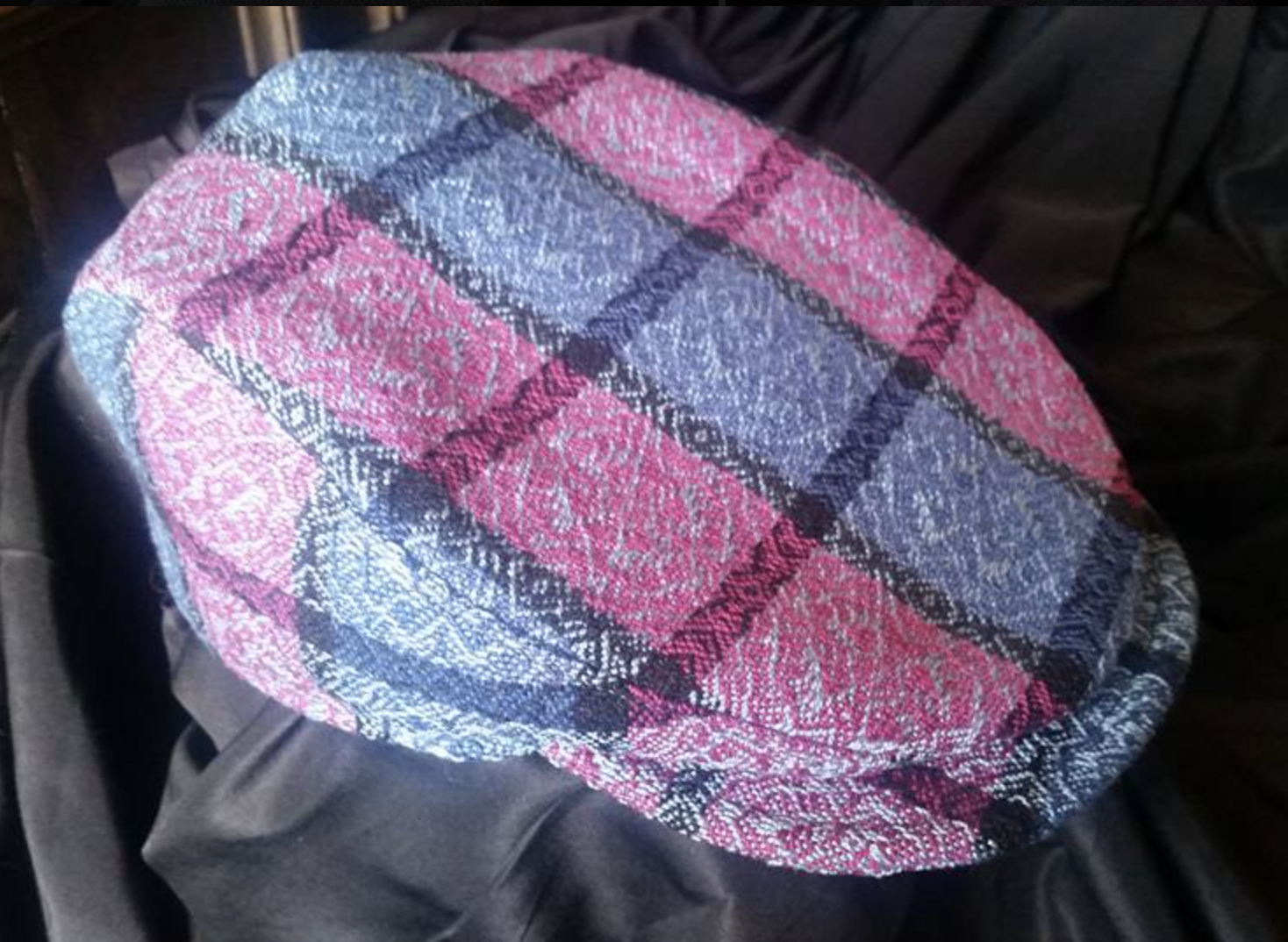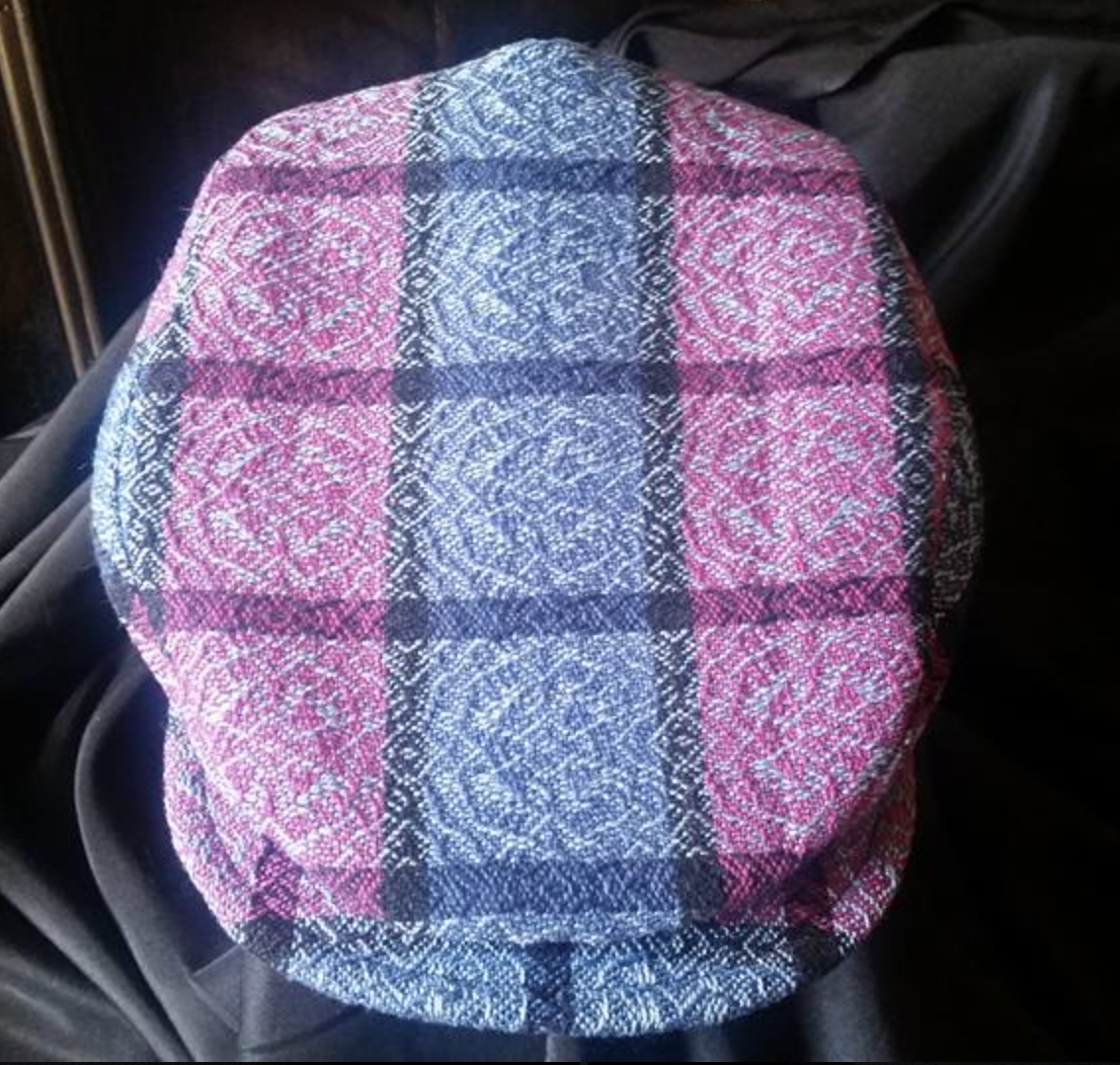 100% cotton. Magenta, ink blue, blue, and black. (Actual hat is slightly dark than the pictures). Pansy floral motif.
