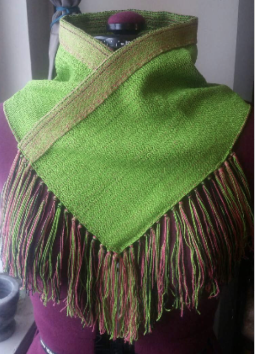 This piece was woven on my Watermelon warp with granny apple green as the weft (dominant) color. The collar has been hand sewn for a beautiful contrast detail.