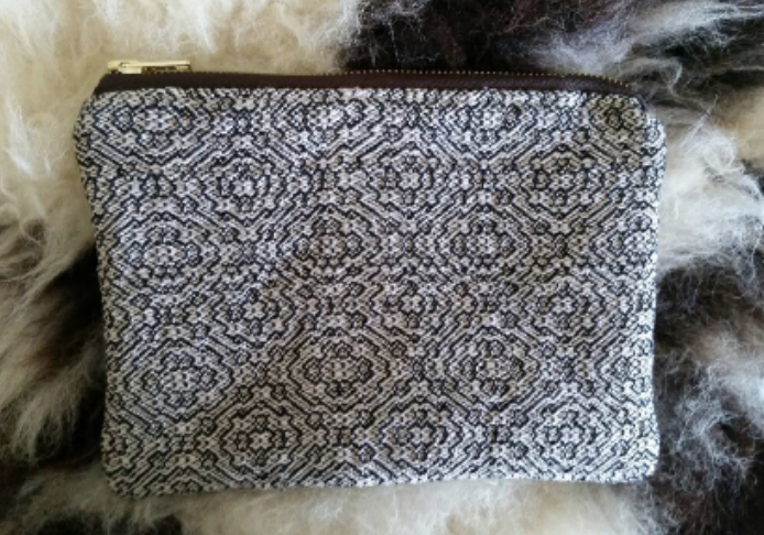 The Ella zippered bag features a 100% mercerized cotton, handwoven outer shell in cream and black. The zipper is plated metal.