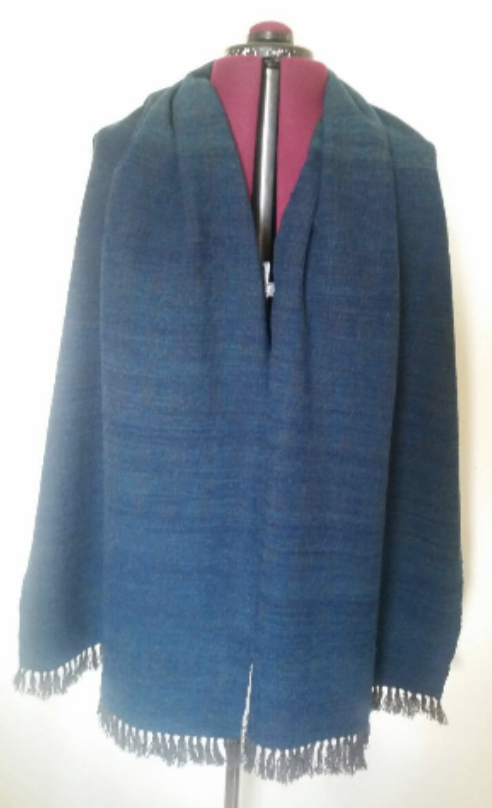 Blue Queen is a 100% wool wrap. Woven using fine, 30's wool. Weft dyed in shades of blue, laid on a light heather, and chocolate brown warp.